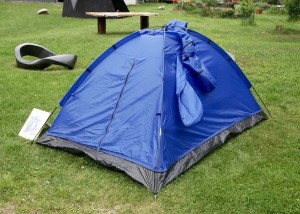 The belt inside the suit can carry accessories, including folding tent poles and a tent base that can be attached to the bottom of the dress with Velcro straps.